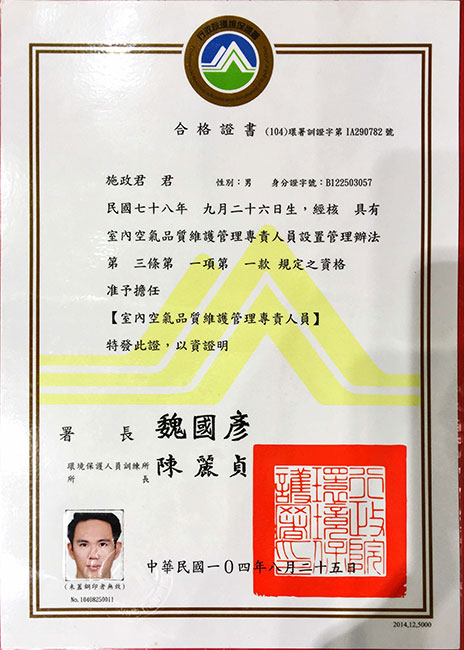 祝賀靖江酷爾比特機(jī)械有限公司臺灣總公司施政君先生獲得《室內(nèi)空氣品質(zhì)維護(hù)管理》專員資質(zhì)